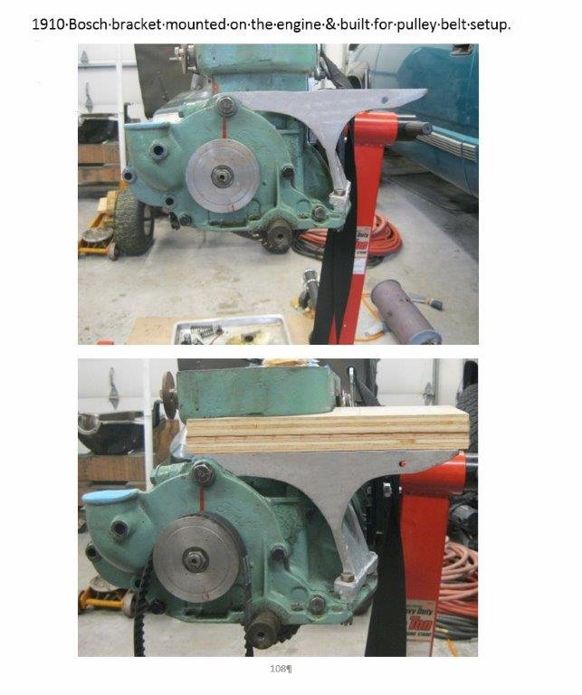 For those who have purchased my book on Amazon, I have corrected spelling errors on pages 30 and 31. Also, the update below shows how it looks in the book “Who D.A.T. Ignition System”. Included below are the new pages 108 thru 114 that you might want to print out and add to your book. The pages show the building of the 1910 Bosch bracket attachment to support the pulley belt setup and another way to connect the drive pulley sprocket camshaft gear.