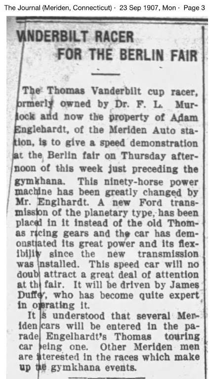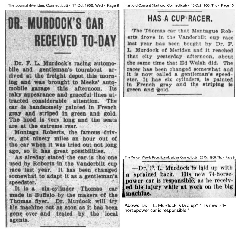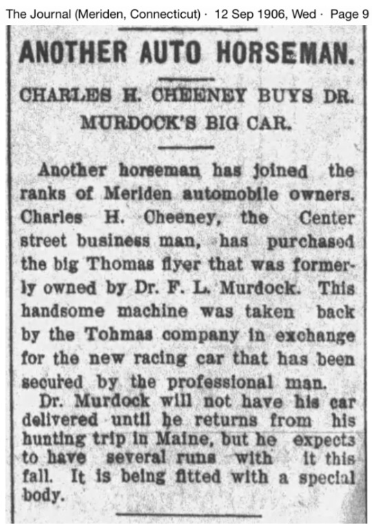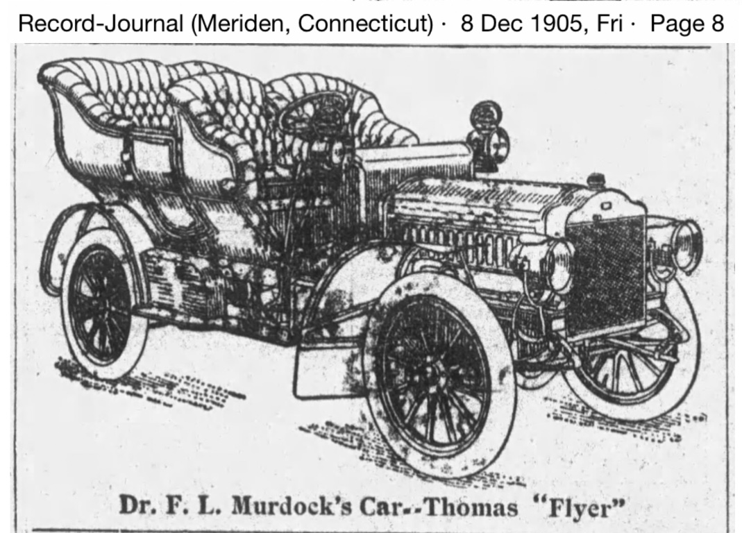 During the summer of 1906 we learn there are now six Thomas Flyers in Meriden, including Dr. Murdock's, and another person who will factor into this story, Adam Engelhart: