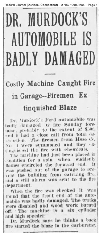 Then, in early November 1908, disaster strikes for the Murdock's Ford Six. We learn they did indeed still possess their Ford Six. Unfortunately it's badly damaged by fire as the Dr. was preparing to take it on an outing: