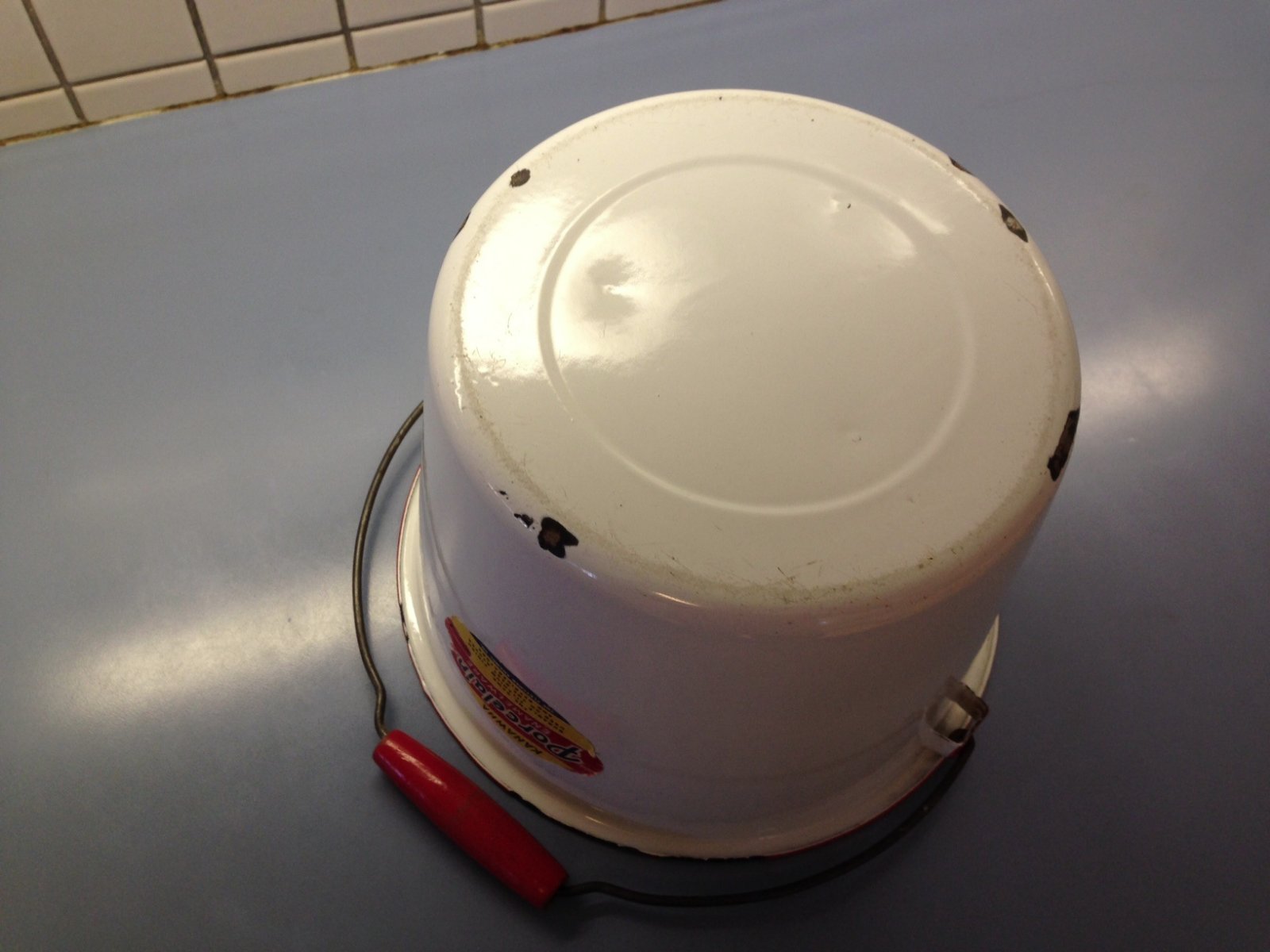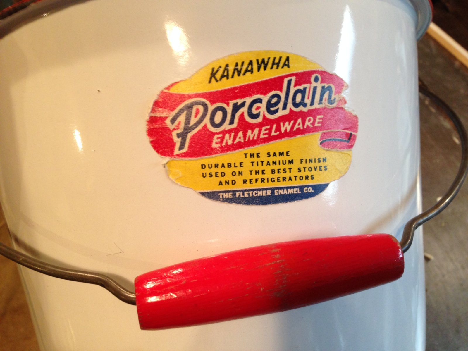 This pail is indeed in nice shape but may not be as old as it appears. The material is fairly light and the label has a newer look to it. A bit of online poking around suggests this piece dates back to the '50s. I combed a couple of antique malls yesterday looking for this sort of thing and was surprised how much enamelware is still around.
