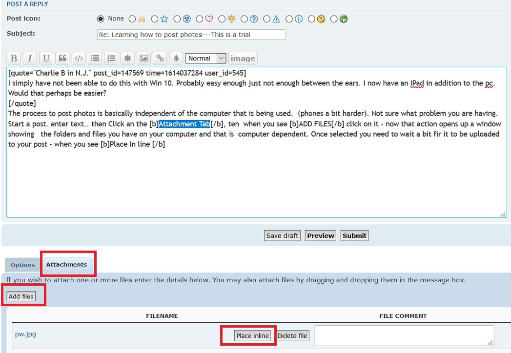 The process to post photos is basically independent of the computer that is being used. (phones a bit harder). Not sure what problem you are having.Charlie B in N.J. wrote: ↑Mon Feb 22, 2021 6:41 pmI simply have not been able to do this with Win 10. Probably easy enough just not enough between the ears. I now have an IPad in addition to the pc. Would that perhaps be easier?