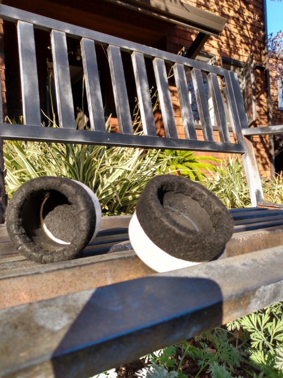 So, I just fabricated these little jewels for him. They are 2" PVC caps with inter-tube rubber lining (secured with contact cement) and an adhesive felt pressure rim (purchased off Amazon). They fit snugly 'like a velvet sheath' over the front hubs, protruding out only 3/16" from each hubcap (the thickness of the PVC). Now, no longer will he need to worry about damaging his treasured NOS hubcaps, at least when he's hopping on and off his skinny trailer.