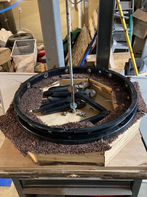 I replaced the foam pad with Masonite to let the felloe slide more easily. I had to block up the felloe to let the front hub go down all the way.