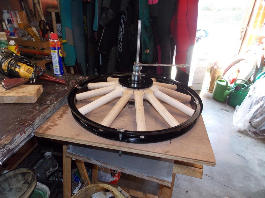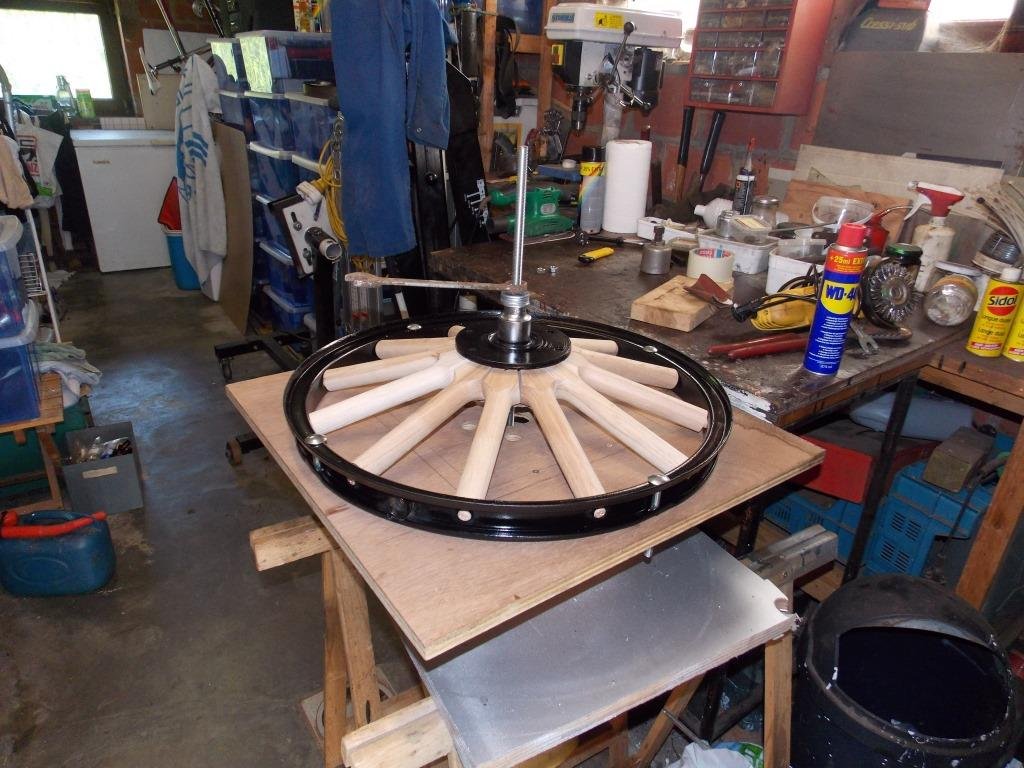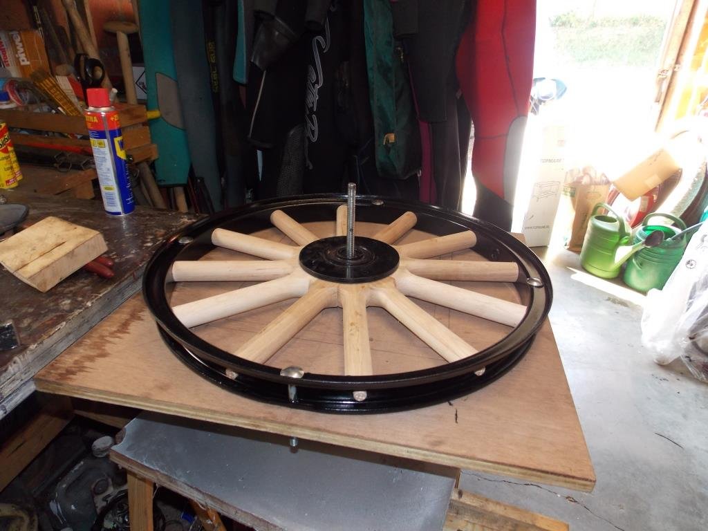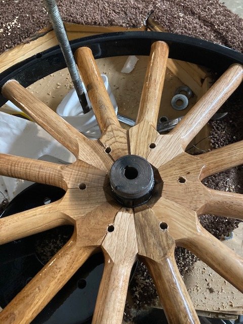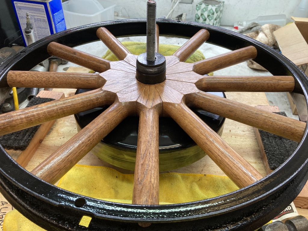 I just finished my 2 rear wheels last week and used a hammer and a putty knife on the few spokes that were sticking up a bit. That settled them into place and didn't marr the finish. Keeping the lacquer off of the inside mating surfaces is key. I also had misalignment of the holes at first and I just turned the whole assembly over, blocked it with 2x4's and pressed it apart and started over. Easy.ivaldes1 wrote: ↑Fri Feb 26, 2021 4:29 pmFinished with one sort-of. I have some slight misalignments of the spokes. I will use wax on the adjacent faces next time so they slide. Are the gaps shown especially in the last photo not acceptable? I may be able to improve on them with more tightening. Unfortunately my arbor press is just slightly too small to put the whole wheel in and press the spokes like one of the video shows.