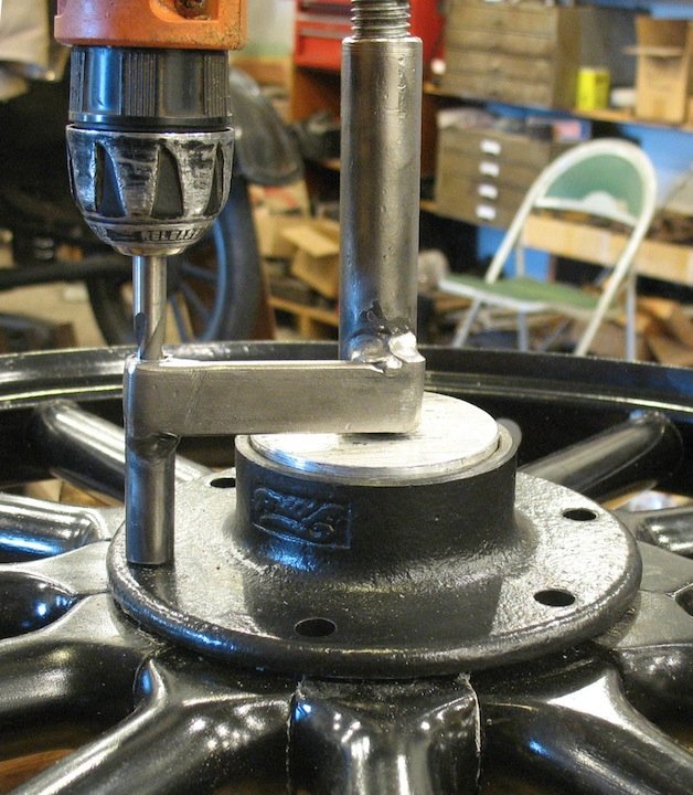 If you do not have a drill stand that go over the wheel, just spot weld two small drums straight together. The distance of the holes will make you a guide to drill the bolt holes staight.