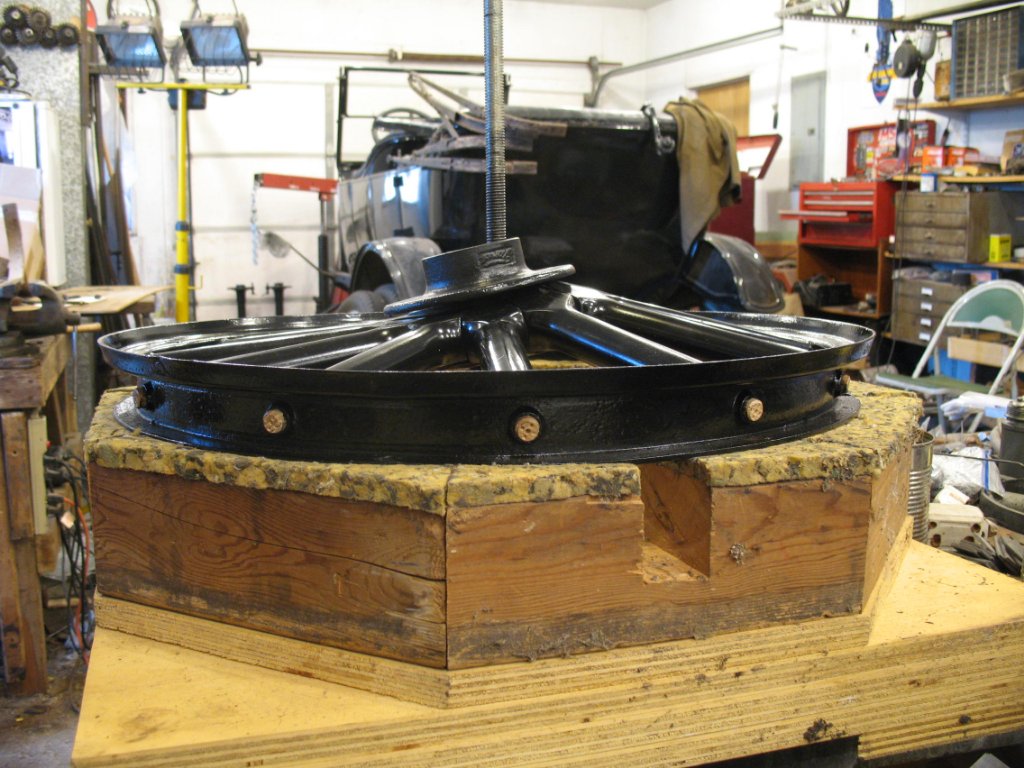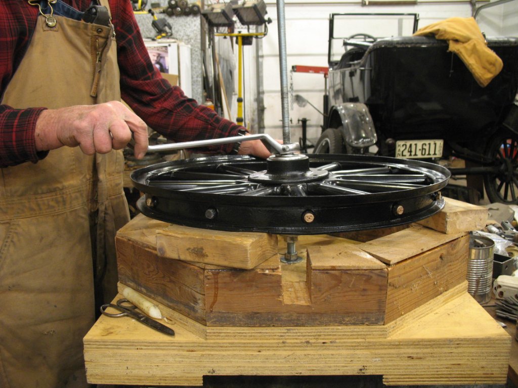 . The press (and patience) makes this unpleasant job just tolerable. Don't make the same mistake I did and figure out ahead of time if you have Kelsey or Hayes fellows or Ford fellows BEFORE you stain and finish the spokes. Thankfully I sourced some Ford fellows for the Ford spokes I spent days finishing. Doing 12 at a time isn't a bad idea. Start to finish with 3 different shipments of spokes from Langs was 3 weeks. Thankfully I bought a 1930 Model A roadster to keep me busy while the lacquer dried...