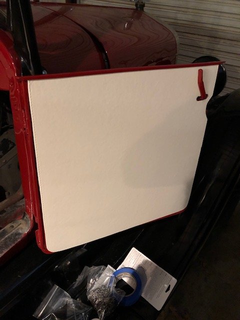 Some cutting needed at the slot for the handle, a paper pattern helps, or use chalk impression of the handle swing. Metal bezels are fitted to the cut slot to prevent handle wear and at the latch too (unless the repro door cardboard is vinyl covered and has stitched hem).