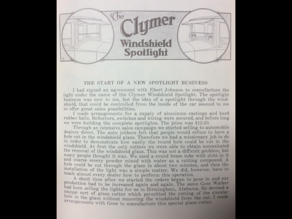 Clymer's spotlight company made a device for cutting the hole in the windshield, It consists of a cast iron cup with a "C" clamp arrangement to clamp it on to the open windshield, It has rubber gaskets against the glass and a hole in the cup with a cork stopper. Inside the cup is a "cup shaped" cutter with a shaft sticking out to attach a drill motor. To use it , remove the cork and pour an abrasive and some water into the chamber, and grind a smooth hole in the glass. It has a brass tag attached identifying its use. I think it came with a small can of abrasive.