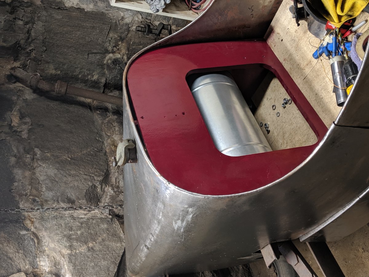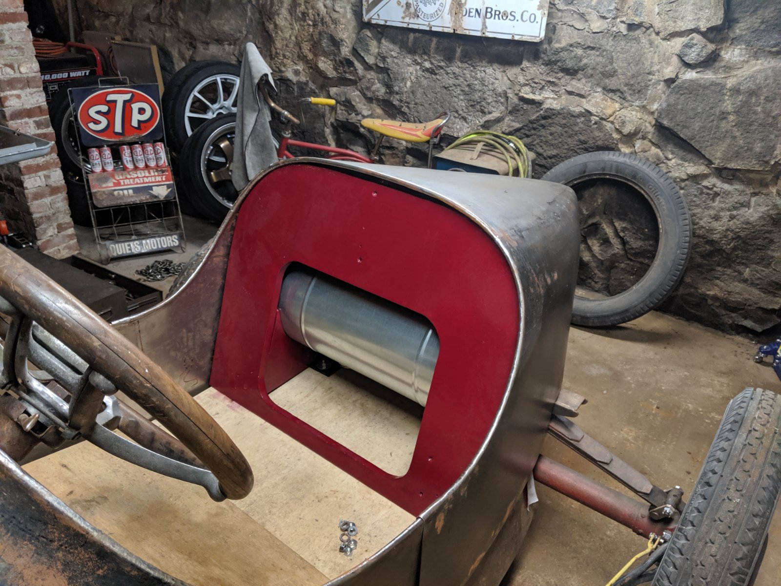 I then began working on the fuel system. The gentleman who builds the reproduction T tanks made me a custom one which is 3" narrower and sits behind the seat nicely. I then got a fuel fill adapter which threads into the tank, a fuel coupling, some t radiator hose clamps, a brass pipe, and a cool old brass flip top filler and created the filler neck. I used a harbor freight hydraulic knock out punch to put a perfectly round hole in the body. I also soldered the filler cap on because the tank will be pressurized.