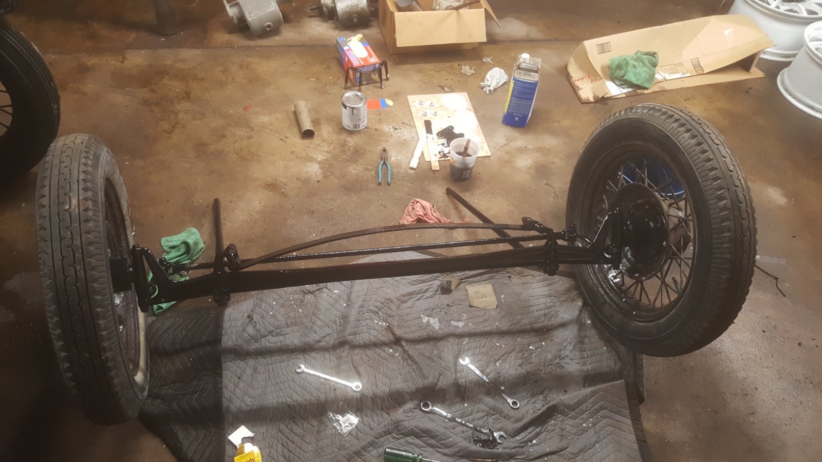 I stripped, blasted, and painted the front axle, as well as chopped up the front wishbone to be mounted to the frame.