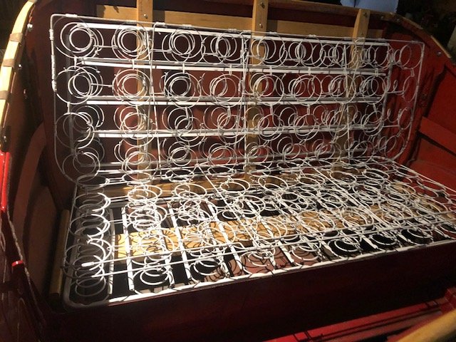 Seat upholstery is fairly easy, make a simple plywood base and 2x4 stringer, with two long all-thread rod at each end to compress the spring inverted over the upholstery. Then fold in the crimp channel. Rear hip pads go in first, then hang the rear back spring, with simple looped strips of material, positioned over the finished seat. The rear backrest upholstery then is fitted over the backrest spring.