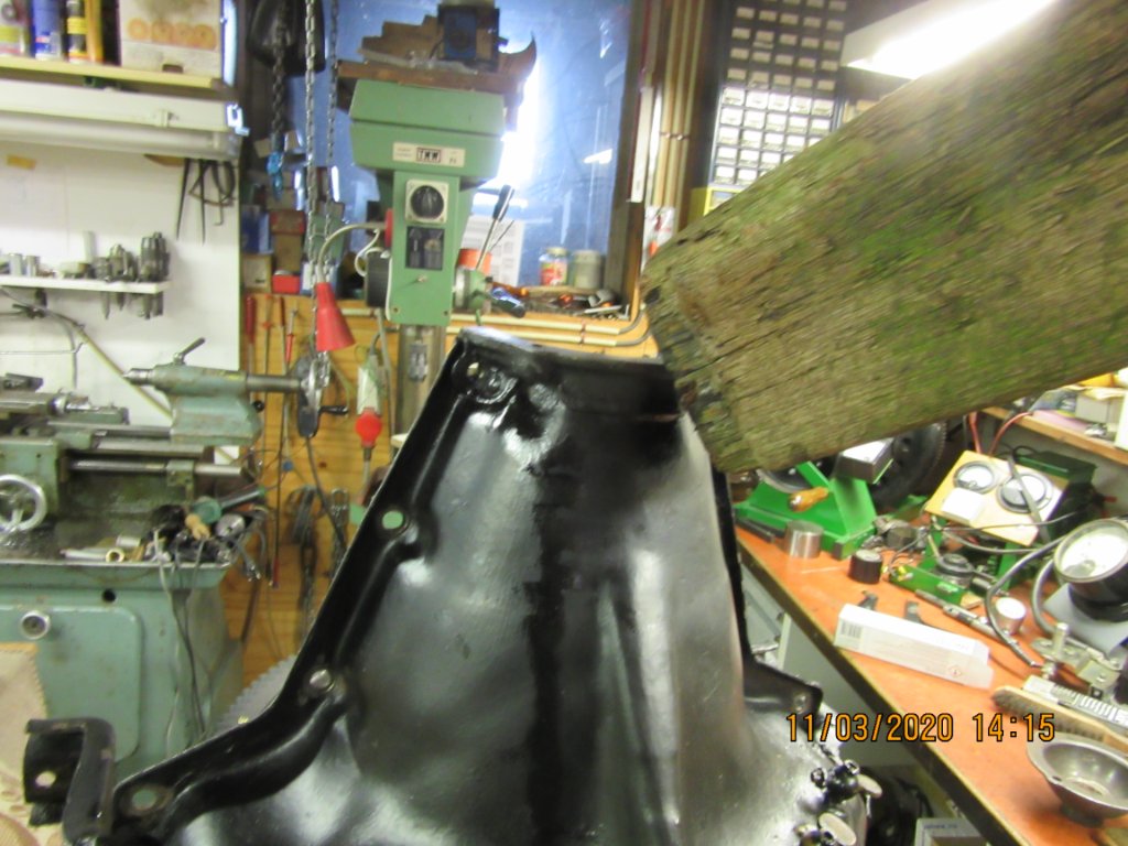 I resorted to a similar process to Mark. On my 1915 pan, which I first set up on a pan jig to check for straighteners, it was perfect when I had finished with it. On assembly, the fourth.main was 1/16+" out. Before tearing it off and having another try, I let it sit for a day or two while I considered the problem, and came to the conclusion there was nothing I would do differently. So I used a jack and chains to persuade it to fit. The early pans without the rolled edges are prone to easy flexing. I Checked again with the motor vertical on the stand Before I was happy.