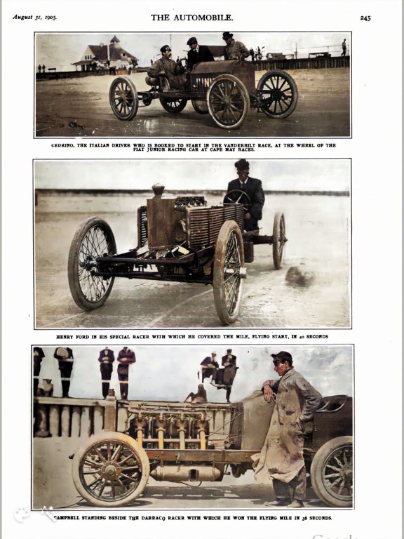 Colorized magazine photos of Cedrino with his Fiat, Henry Ford, and A. L. Campbell. Henry Ford set a world record (1 mile competition record), defeating Campbell in his Daracq. However, Campbell filed a complaint saying the Ford was ahead at the flying start, and the record was disallowed: