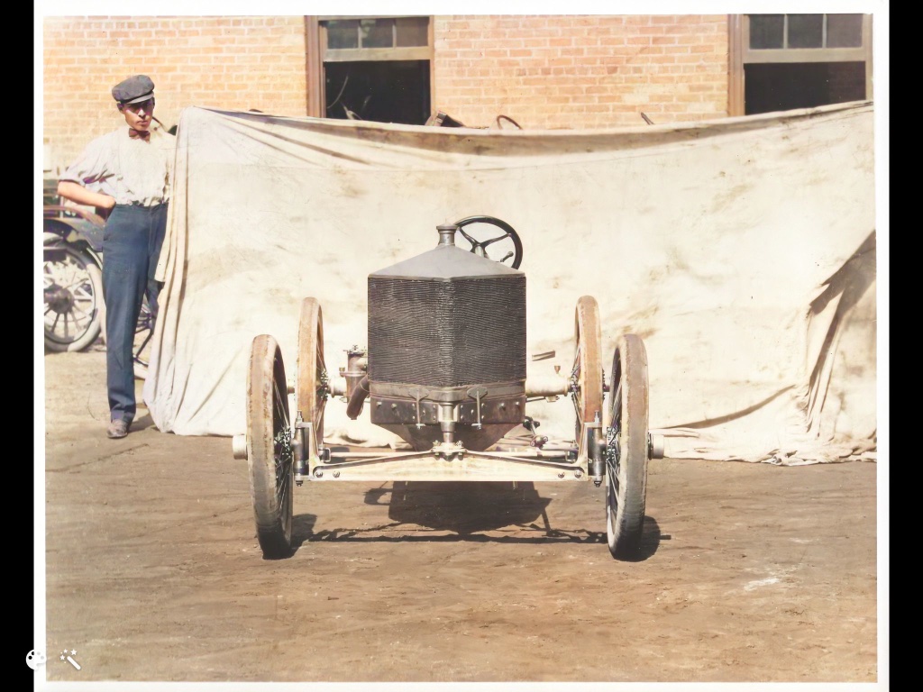 Another FMC long time employee August Degener, holding "background" for official photo of the last Ford Six racer sometime in the late summer or early fall of 1907: