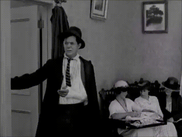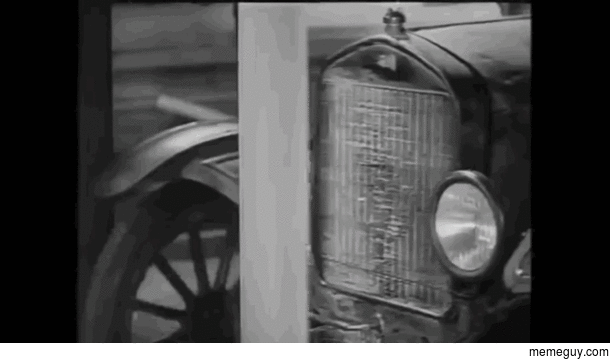 Can you IMAGINE the planning, the care it took, the time three actors needed to sit so still while the pieces were carefully assembled around them! All for five seconds of film time. Most of that "car" is sitting there with nothing holding it together, pieces propped and balanced giving the illusion of a whole car until off camera stage hands pulled a piano wire to yank the wheels off the axles and drop the thing into a pile!