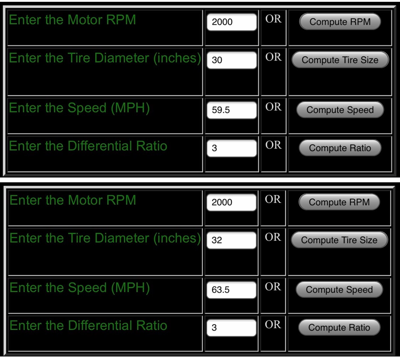 According to this online calculator, at 2,000 rpm, a car with 3;1 diff will go 4 mph faster with the two inch increase to 32 inch wheel/tire: