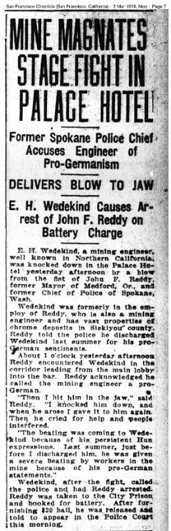 In 1903 the election of a new Mayor in Spokane, Dr. Reddy is no longer Chief of Police. By 1904, his interests in mining and hotel ownership have taken him to Medford OR, known for it's fruit orchards and growing mining prospects: