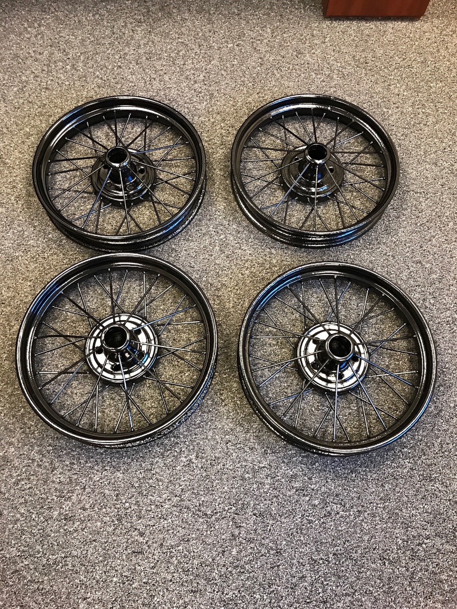 Powder coat. Ed I agree as for slipping the tire I'm with kevin it depends on the loose nut behind the wheel. I think even painted wheels can slip . When I bought my 23 touring under the back seat was a spare tube in a ziplock bag and powdered up . Guess even in old days they had problems with the tubes . After I drove the touring I figured out why he had the tub under the seat. These are just 26 wire wheels now I've got pharis wheels on
