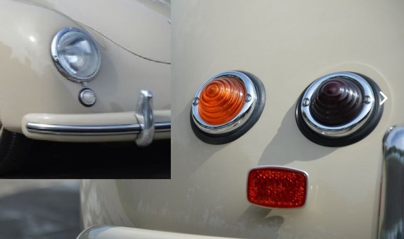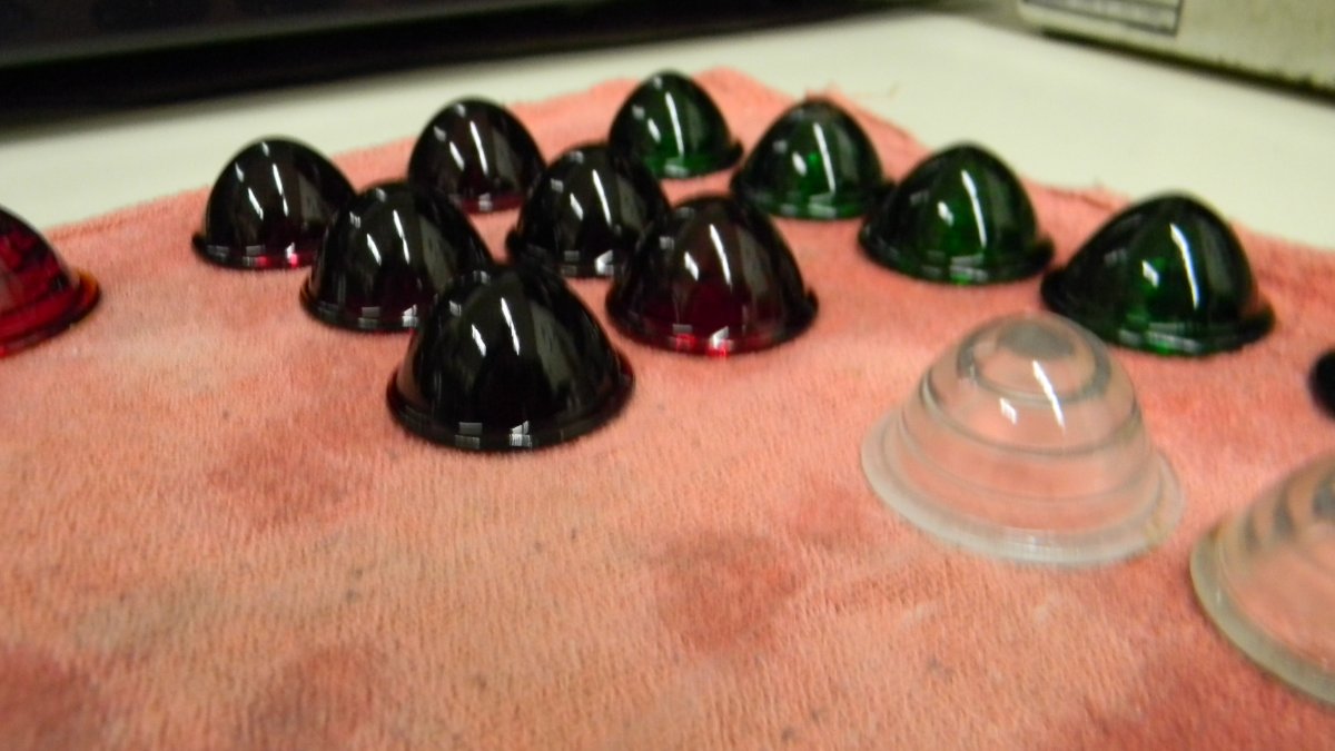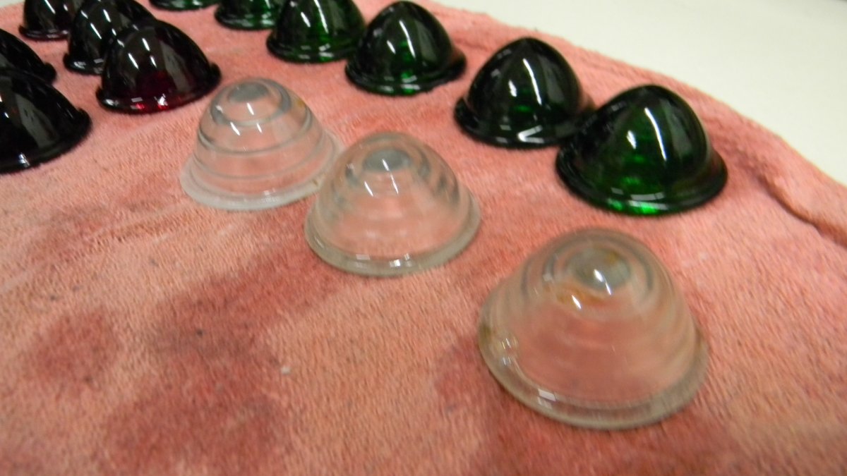 But those to me look like common commercial clearance lights as used on commercial vehicles, vans, box trailers, flatbed trucks and trailers beginning in the very late 1930s and all through the 1940s-1950s and 1960s. Harsh working conditions broke a lot of those domed lenses so replacements were sold by the thousands! Most common colors were amber and red. Blue and green were also used for special applications. They were made by several companies, and sold in almost all automotive supply stores for decades. Flatbed and box trucks were required in many states to have a lamp every so-many feet. Hence, 'clearance' lights so that a truck could be outlined and seen in the dark.