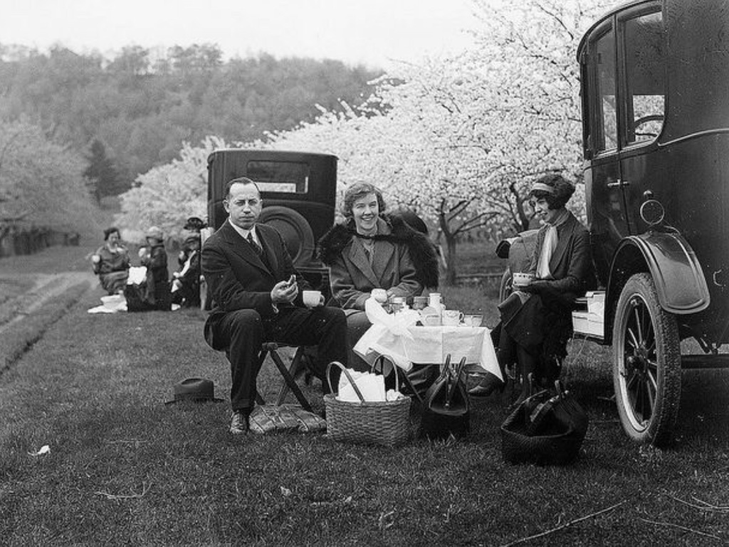 I particularly got a kick (as I always do) of the pic with the people having a picnic next to their car all dressed up in