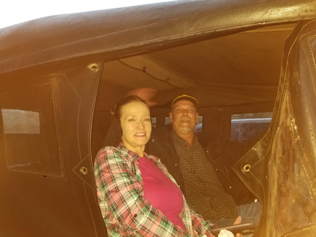 Mine is my wife and I arriving at a Halloween party a few years ago. It was about 45 degrees and rainy. The side curtains kept us warm enough that she didn’t have her coat on for the ride home !