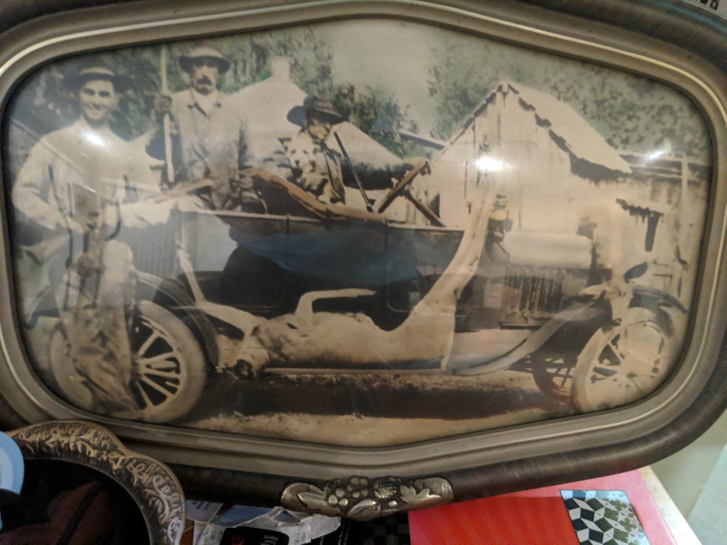 21st picture, (9:50 am) is really neat! A touring car, year unknown, between 1917 and 1922 (likely earlier from looking at the wheels?), no 'electrics' package (no starter, generator, or battery). However it has an elaborate fixed top assembly with 'flexible' side windows that slide up into the roof, and front frame pieces that fit around the standard touring windshield! The back and rear sides look like a real sedan! Sort of? An interesting way to upgrade into an enclosed car!