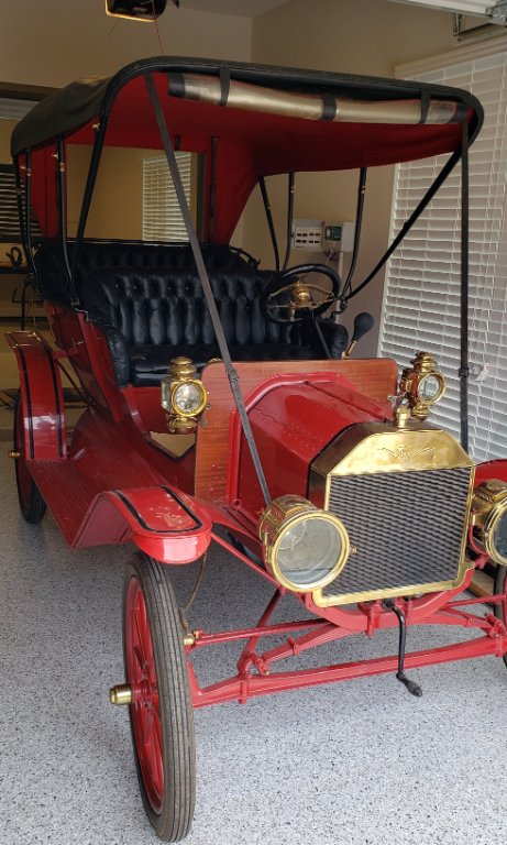 The LAST piece of my early Canadian '13 is now corrected out. FINALLY!!! The correct all brass Victor carbide generator. My car is basically a 1912 chassis with a 1913 body. John Brown model 19 lights and model 105 tail light, E&J cowl lights, and the Victor carbide generator. My 1912 running board has a very specific "3 hole" pattern with 6 5/16" distance between centers, that only ONE generator seemingly matches to. Three years of research including lengthy discussions with a couple of really hard core Ford experts, and leg work finally led me to which generator had this mounting hole pattern, and that is the very elusive Victor all brass model used from 1909-1912. One of the hardest, if not THE hardest one to find. The "Ford Times" of April 1913 shows a photo of a T with this generator on it. That's a really late date to sport last year's brass! My car was built in Sept. or Oct. 1912, and sold new in Nov. 1912 in Tavistock, Ontario, Canada. This car hasn’t travelled very far from where it was sold new, less than 20 miles from where we live. The only thing that is actually the 1913 model year is the radiator, windshield, and the body. Everything else is all 1912. “B” series engine, number 872. I have all the documentation of the car since new. My grandfather bought it off of the original owner in 1956. B&W photo is from 1929: original owner's daughter's wedding. Lot's of original details! Note the wrong later engine pan, and the lack of the locating dimple castings on the front top iron which I've corrected. This picture proves that at least in 1929, this car had a mis-match of lights. I'm pretty sure it's been like this all it's life. Why would anyone replace two cowl lights with two other all brass ones when the car was only 16 years old. No one would have cared then what brand or they looked like. Since it's a pre assembly line car, I think Ford used up all their old parts and my car was one of those.