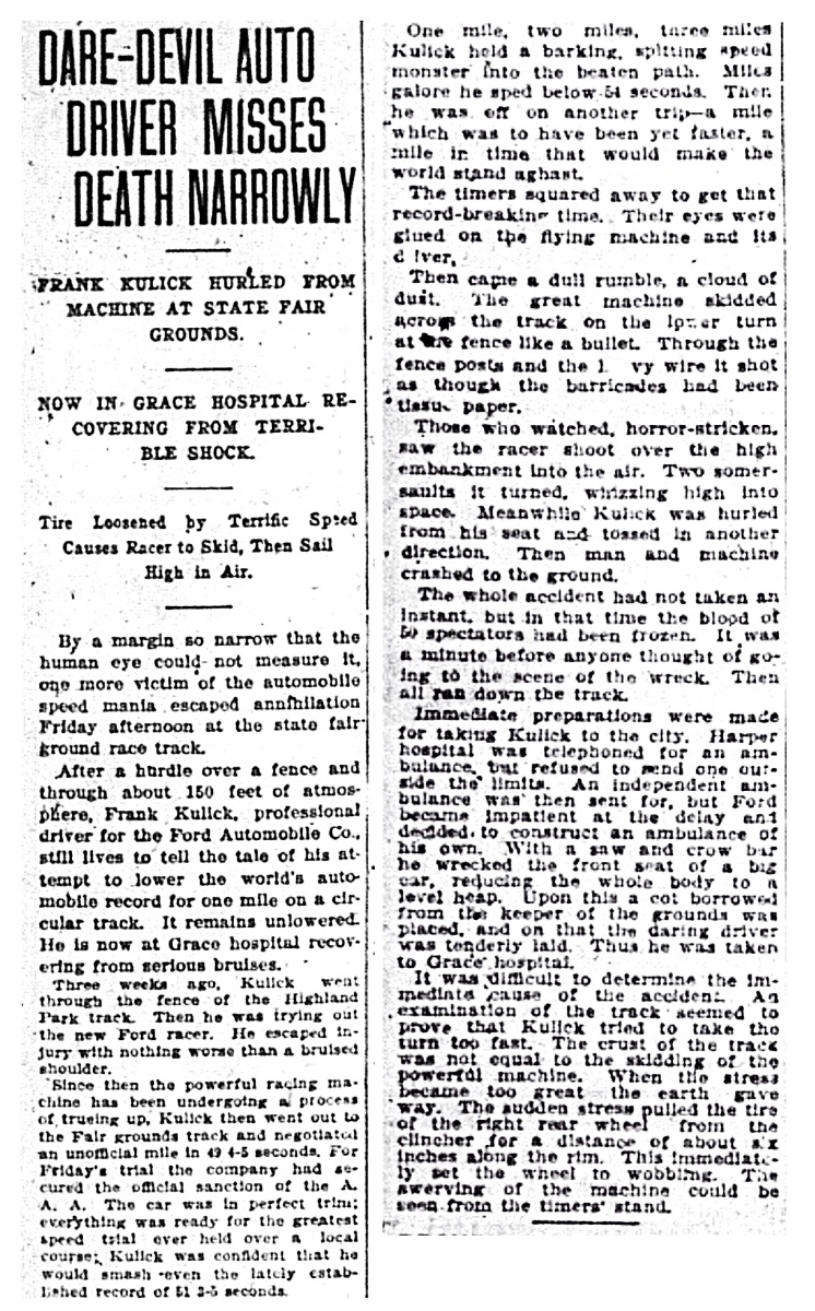 This time, Kulick was permanent injured, and wore a leg brace and walked with a limp the rest of his life. In both cases, I suspect he wouldn't have lived if he had "rode it out" with a lap belt. I think these machines disentegrated in severe wrecks, and the best outcome was being thrown clear of the wreckage.