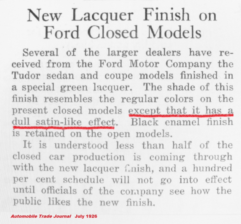 The reason I ask, if the 1927 model year vehicles only used Pyroxylin type finishes was Channel Green offered in Pyroxylin? Or did Henry Ford use both Enamel and Pyroxylin finishes for the bodies in the 1927 model year also?