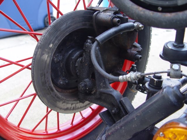 Here is a picture of one of the front disc brakes, and a picture of the split wishbone doubled up. If you have front disc brakes you definitely want to double up the wishbone to support the front axle. I recommend four wheel hydraulic disc brakes for anyone who drives over 45 in traffic. I always allow considerable stopping distance in any vehicle I drive, but the brakes on my speedster are good enough that I do not feel I have to allow any extra stopping distance beyond what I normally do.