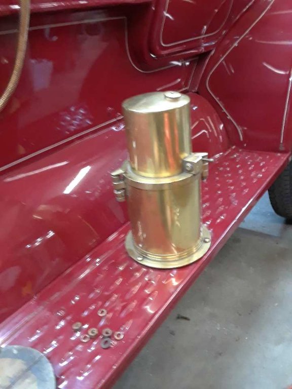 I use a 1/8 inch rubber pad under the base and mount it to the running board. You should have a small round hole in the apron for the red rubber hose to go through from the generator to the light tube at the bottom of the fins inside the engine compartment. From that tube you should have rubber hose going to the headlamps on either side. That generator looks to be a Jno Brown style generator judging from the 3 hole base mount although it could be a Corcoran but most Corcoran’s had 4 holes I believe. I would use flat brass washers and brass bolts on the top side and brass nuts with lock washers on the bottom. Is your generator a reproduction? Do you see a makers stamp on the base of the water tank close to the valve? It’s generally to the left of the valve if it’s an original JB “UNLESS ITS BEEN POLISHED OFF, HA.” The size of your generator is fine. Curious, what type headlamps & sidelights do you have? Is this an original 11? Good luck. Best John