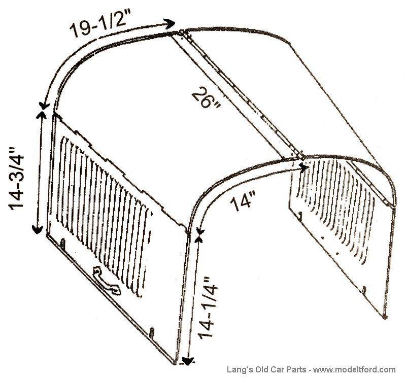 And below are from Lang's showing the dimensions on the 1924-25 car hood verses the 1926-27 car hood. (Note Lang's uses 1923-1925 -- but the early 1923 cars actually used the same size hood as the 1917-early 1923 cars. The handles were no longer riveted to the hood starting in 1920 but instead were fastened to the hood without a separate rivet -- causing a "hole: to appear where the rivet was on the earlier hoods. (Ref: page 235 of Bruce McCalley's book "Model T Ford.") Note Lang's also sells just the one-piece top hoods for speedsters.