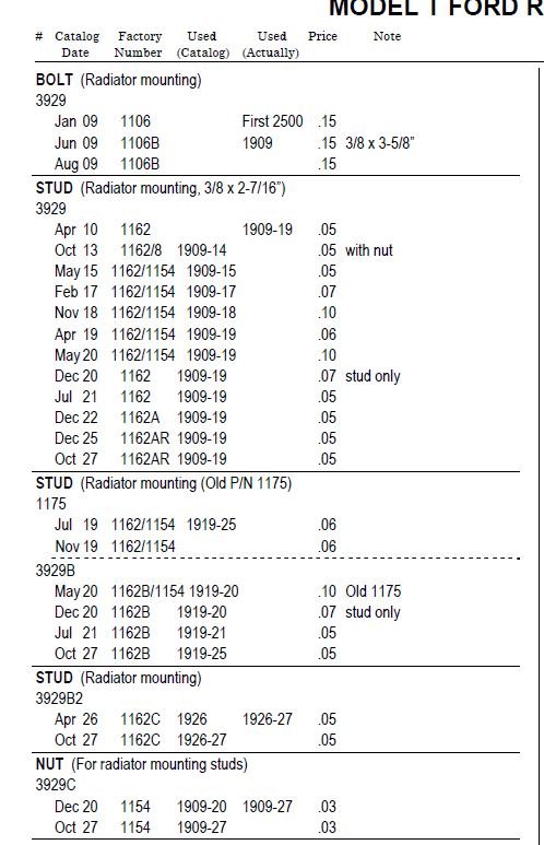 So far the only item I have found that is listed differently is the stud that the radiator mounts to. A scan from Bruce's Comprehensive Encyclopedia is shown below. For any commercial use -- please contact Barbara McCalley or to order a copy of the excellent 2 CD disc material see the posting at: http://www.mtfca.com/discus/messages/822076/844722.html