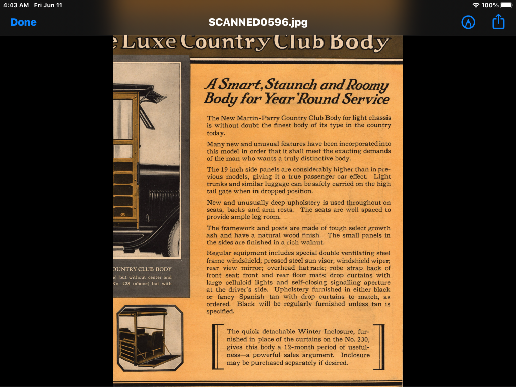 M-P saw the handwriting on the wall when Ford, for the first time ( if you don’t count the 1912-3 delivery bodies) entered the custom wood body business with the December 1928 introduction of their own station wagon. M-P soon afterwards sold out their body building business to General Motors, with it being renamed Chevrolet Body Division. I believe Martin-Parry continued on with their metal cabinet and storage unit business way up into the 1940s