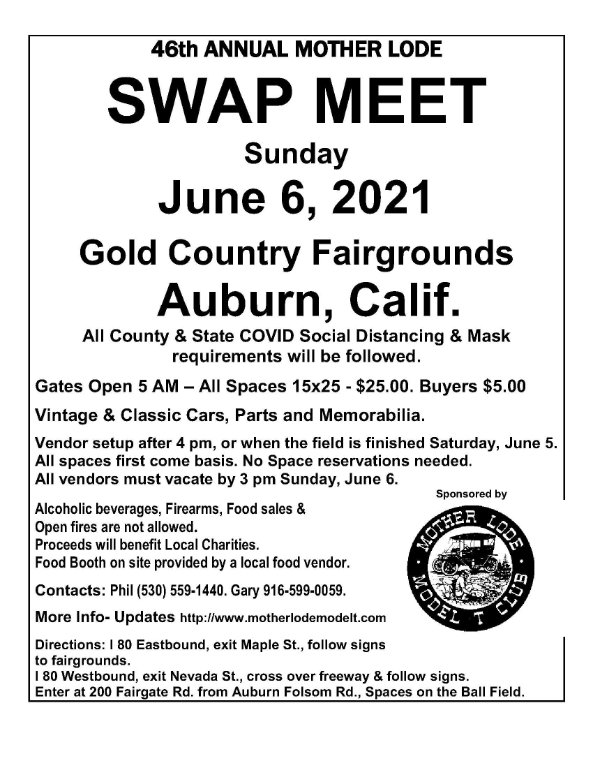 Mother Lode Swap Meet June 6, Auburn, Ca. No need to reserve a space. We have plenty. Most on Grass. Link to prior years photos. https://photos.app.goo.gl/jozYcr7JXyQ42DDw5