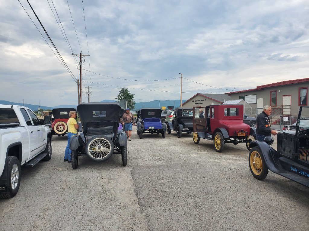 Had a good day today, almost 300 miles driving with about 204 on the clock. We saw some beautiful country along the way. We are currently 11th out of 20 cars that started and hopefully will finish in at least that position tomorrow. We have about 86 miles to go tomorrow to round out a total of 500. We had a exciting moment in the 4th leg this afternoon (temp in high 90's), leaving the starting point with a climb up a mountain. It was fairly steep and unfortunately we had a strong tailwind. This is a problem because everyone on the Montana 500 runs without a fan (too much wasted power!). Well, going slow up a hill with a tail wind, no fan and with outside temp in the 90's is a perfect formula for overheating which is what happened. The water (half antifreeze) got to 230 degrees and we barely made it up without stopping to cool down which would have ruined our time! We made it OK. My spouse, Lorna, is back home in NM and has been watching our progress on LIFE360 and got worried yesterday when we left cell coverage and her cell phone made it look like we were stopped along the road! Having a great time, will have to come back again now that Kirk Peterson (his 24 coupe and driver) and I (mechanic) will no longer be rookies. Great bunch of people to interact with, they know their Model T''s!