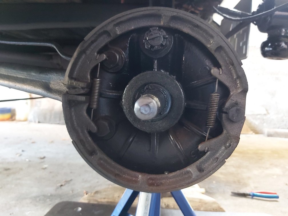 Yesterday at least I finished to reline the brakes - and of course the linings are too thick with 5 mm (I bought it per meter and obviously did measure the distance in the brake drum somehow wrong). At least after some grinding at the ends of the linings (and YES I am aware one should not do it but that must do it for now ...) the wheel is on again and is turning but the brake rod now is too short so I will add some 'long nut' (when finished pictures will show what I mean). Next step will be to have the car running on stands to let the new linings 'run in'.