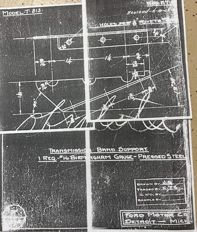 The band support was an “L” shaped sheet metal bracket that was riveted to the pan directly under the transmission on the earliest Model T’s. It seems the Ford engineers felt it was necessary to have something to prevent the bands from dragging on the transmission drums. Most examples of early (very low numbered Model Ts) surviving pans have had the band support removed or broken off. The drawing for the band support is in the collections of the Benson Ford Research Center at The Henry Ford.