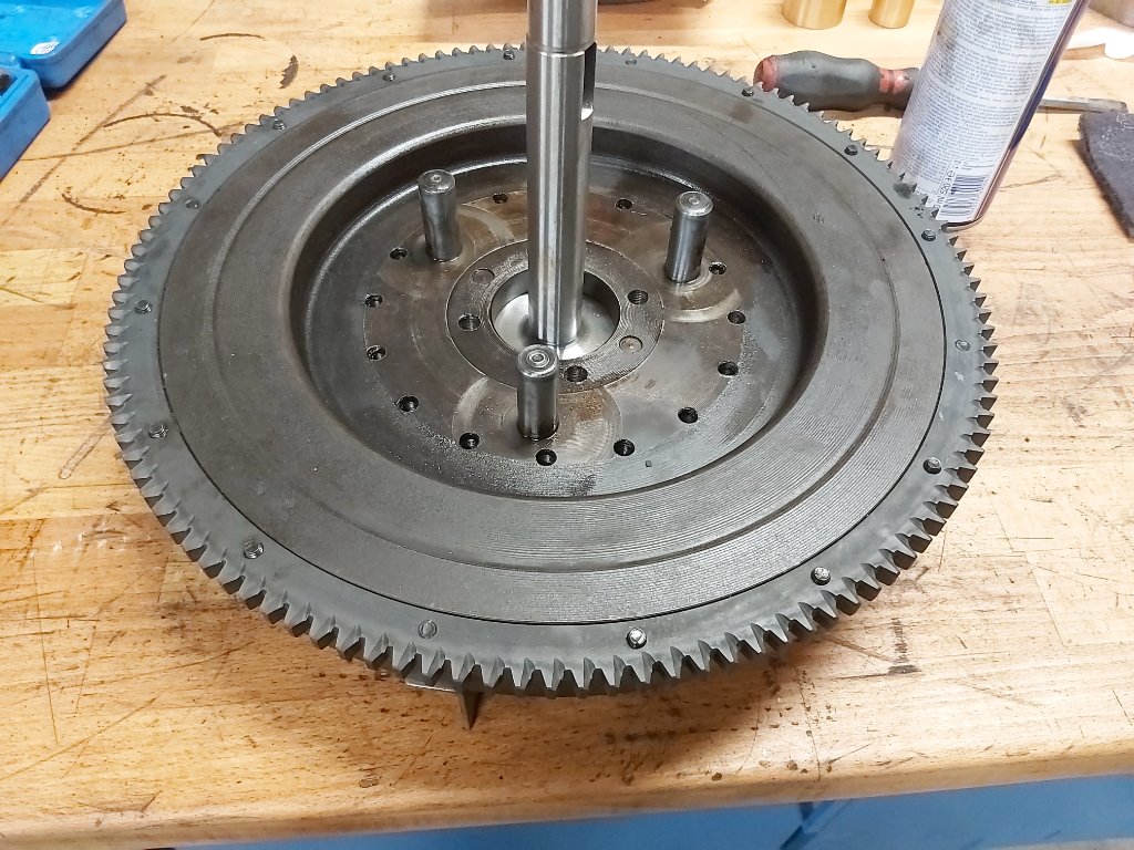 Drums low & reverse individually. I lighten by removing material around the big holes. New drums wont need much work as compared to original drums. Brake drum, by drilling 1/2 & 3/8" non thru holes in the flange face outer edges. Once thats perfect, mount the output plate & do the same to it. Rotate the clutch spring until you get best balance. By the nature of a movable spring, I dont think perfection is possible here. Drum shaft assembled with clutch hub. Lighten on outer diameter away from inner clutch plate slots. Balance tripple gears by weight. Remove material from inner face opposite bushing flange. I use a lathe with carbide. The outer surface is super hard, but can be done. Fly wheel with 2 transmission shafts bolted together.