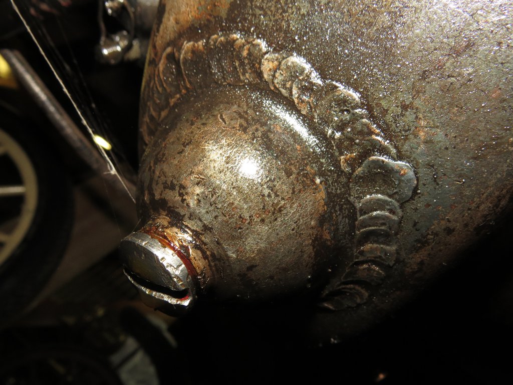 The soldering around the petcock holes is how I would expect to see it done if they were soldered, or brazed, at all on the outside. It looks to me like the brazing, inside the pan, on the upper petcock fitting on #1400 cracked and I think the solder job was a way of fixing it without disassembling the engine. Would still like to see a pan closer to #1400 on this issue.