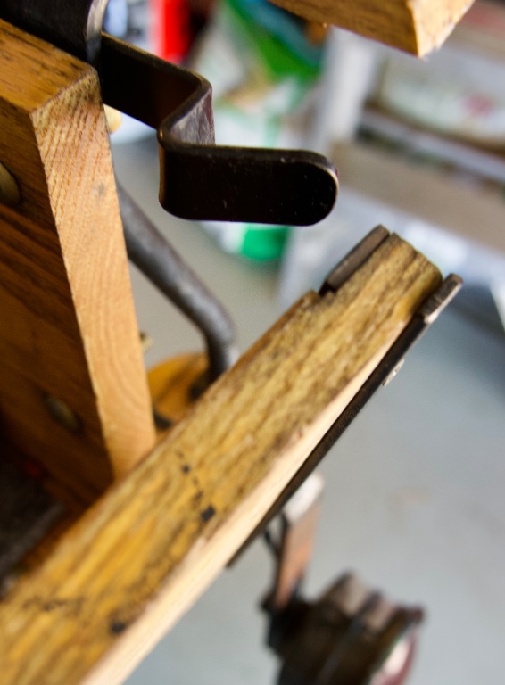 It’s not “lacing” like the later style hoods that have woven padding threaded in-and-out on the radiator and fastened flat to the cowl. The brass cars use leather pads on the underside of the hood panels, slipped into a crimped channel like this…