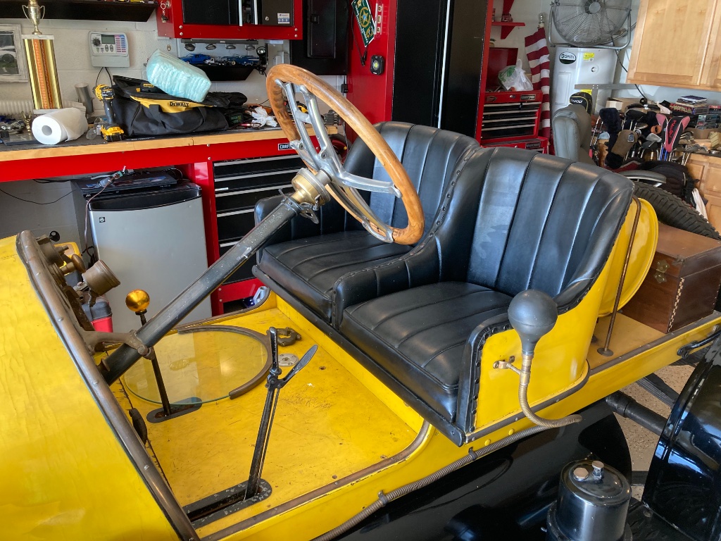 Hood and front fenders are basically 1915. Hood former, rear fenders, and lamps are 1914 or earlier. The Rajo, the Ruckstell, the Atwater Kent, the steering wheel. all are later accessories. Most were not manufactured until about 1920. The wheels might be as early as the late 1910s. From these photos, most of the rest of the car, I can't tell what year the parts are.