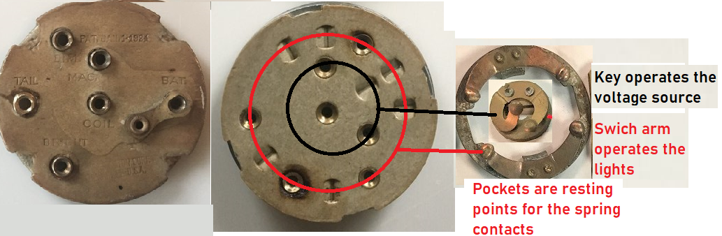 Here is what the switch internals look like. As stated above the inner switch contact ring that rotates between the MAG & BAT contacts only makes contact with one or the other. Can you explain how/where this jumper is connected "My car runs with a jumper from battery to coil and key off." and how you disconnect that voltage source.
