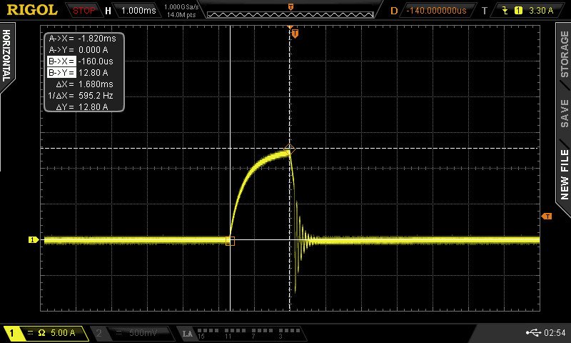 Arnie, The current and time scales in the oscilloscope screen capture refer to the large white boxes on the display. Each large white box is further divided in to 5 sub sections. For example, time on the X axis is 0.001 seconds (1ms) per large division and 1ms/5 = 200us per sub section within that large white box. Current is measured on the vertical Y scale and is 5A per large division or 5A/5 = 1A per sub division.