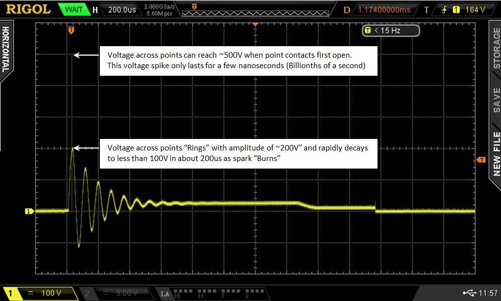 Operating coil points that have been properly maintained and adjusted can develop voltages as high as 500V for very brief intervals as spark is initiated and remain at around 200V for longer intervals during the spark interval. Here is some measured data I took to illustrate.