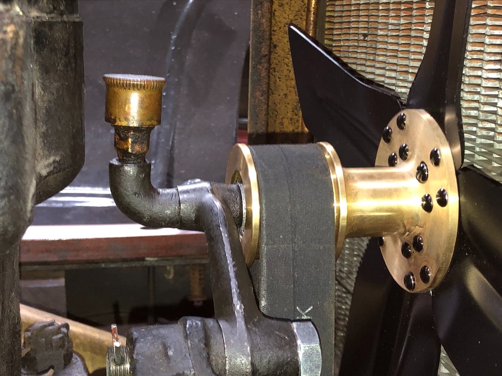 SpeedyT spotted that the grease fitting elbow for the fan on my Frankin T '14 was a clever improvement by a gifted builder and not an original FORD part. It looked so at home and worked so well I assumed that Ford built it that way. Now that the ball bearings in the hub rendered it no more than an ornament I could retain it or go back to original. This car is a mixture of parts so there is no real reason to be original except that it pleases me to return this car to its stock appearance wherever possible so I added a stock dope cup to an order I had with one of the suppliers for another project on the same car.