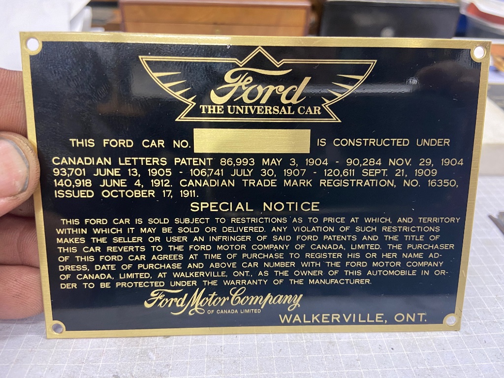 Hi guys, today I am going to a name plate supply company I have used in the past to have this 1912, early 1913 Canadian ID tag replicated, as mine was sadly missing. These folks replicated some 1905 Queen ID plates for me a few years ago and they were perfect. My car had the only original ID plate known and I was able to help other Queen owners have an authentic ID plate. Indistinguishable from my original. I’m guessing these won’t be cheap but they will be very good quality. A good friend loaned me this one which was made many years ago in a very small limited run. If there’s enough interest, making a small run could bring the cost down. This won’t be a money maker for me, I’m just trying to help fellow T friends and interested in keeping the cost down as much as possible. The plates will cost you exactly what it costs me plus postage. If you’re seriously interested please state that here. As soon as they tell me the price and turnaround time, I’ll post that here. Thanks to my great friend Scott Kramer for the loan of the sample replica!