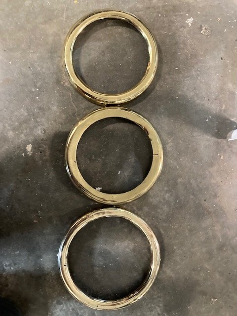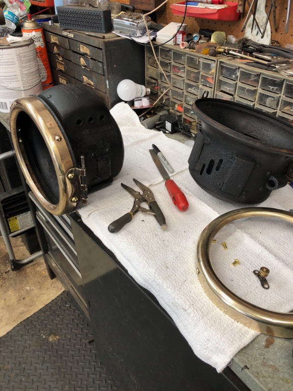So the brass rim with the larger clips MAY be an older modern reproduction (some of those were made using the larger lens clips). Or it is very likely a 1926/'27 originally nickel plated brass rim with the nickel somehow removed. That is what I am using on my 1915. For my car, I got badly cracked originals, and welded the cracks! Quite tricky to do, but it can be done if one makes a 'backing form' to support the thin brass and is very careful with heat control. Afterwards, the rim must in its entirety be re-annealed.