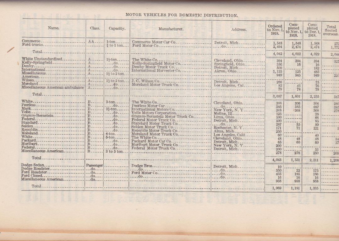 This is from America's Munitions 1917-1918 Report (published by the War Department in 1919), page 502, 503 and 505. Ford is a little past halfway down the list in the first image, at the bottom in the second image and then at the top and bottom of the third image (light delivery and ambulance, passenger cars were classified as light delivery in the report). the report lists the numbers ordered prior to November 1st 1918, number completed prior to November 1st 1918 and number "floated" overseas.