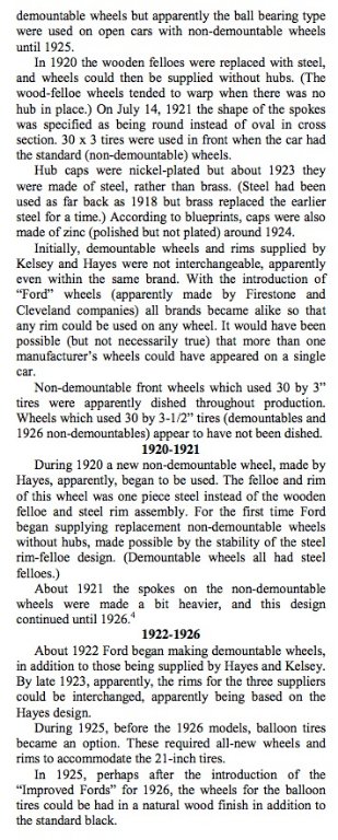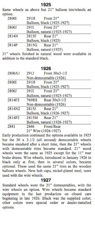 However, I and a few other people at that time had an opportunity to look very closely at literally hundreds of original era and factory photographs from the private collection of no less than Lorin Sorensen! MOST of those photos were never published as far as I know. What I remember about this subject? Because this subject was at that time a common discussion around the clubs, we looked closely at the wheels of a lot of factory photos. And we saw square wood felloe wheels on almost every year car from 1924 through 1927. I cannot swear to 1923, however, I doubt seriously that EVERY 1923 with non-demountable wheels had the steel wheels. Square wood felloe wheels began showing up on cars either 1918 or 1919. I have seen original square wood felloe wheels on 1926s and 1927s with the large brake drums on the rear.